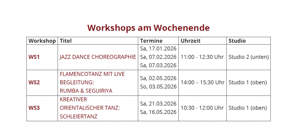 Der Workshop ist ideal für Einsteigerinnen. Fortgeschrittene vertiefen ihre Technik und erweitern ihr tänzerisches Repertoire. Getanzt wird in bequemer Kleidung und nach Möglichkeit barfuß.
